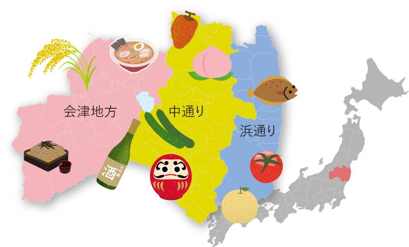 福島県は、日本で3番目に広い面積で、東北地方の南側太平洋に面しています。会津地方、中通り地方、浜通り地方各地域によって気候や文化、県民性などが分かれているところです。
